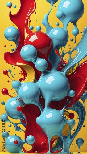 Abstract image with vibrant blue and red blobs and liquid shapes on a yellow background, AI generated