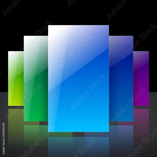 Abstract infographic colorful blue, yellow and green shiny transparent rectangles with reflections on black background