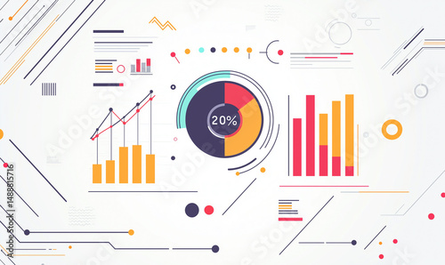 Abstract infographic design featuring charts, graphs, and data points in vibrant colors.