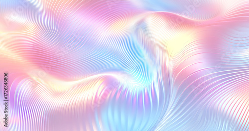 Abstract iridescent wavy surface with ribbed texture, light pink, blue, and yellow pastel colors with a fluid and modern design.