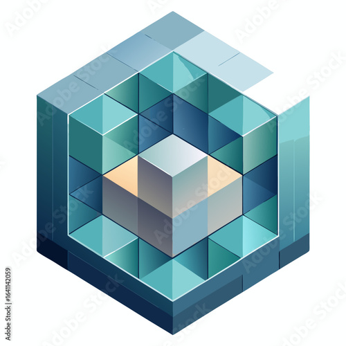 Abstract Isometric Cube: Teal, Blue, and Beige Geometric Design, Modern Minimalist Style.
