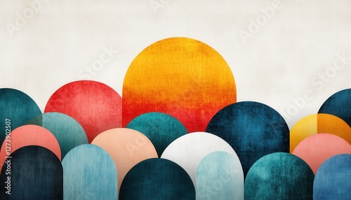 Abstract landscape illustration features textured beige backdrop contrasting with rows of semi circular shapes. Dominated by an arrangement of