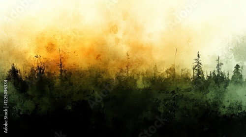 Abstract landscape painting with dark green and yellow tones, depicting a hazy forest at sunset. The texture is grainy, with splashes of light and