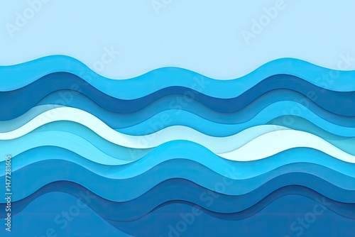 Abstract layered waves in shades of blue and white. Soft, undulating forms create a tranquil ocean scene. Paper-cut style effect