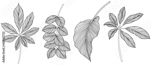 Abstract leaves isolated on white collection. Tropical leaves set. Hand drawn vintage illustration.
