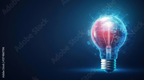 Abstract light bulb with holographic globe and tech elements symbolizing global innovation