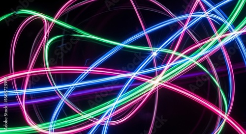 Abstract light painting with neon streaks of pink, blue, and green on a black background. Perfect for tech backdrops, digital art, and modern designs. Cyberpunk style.