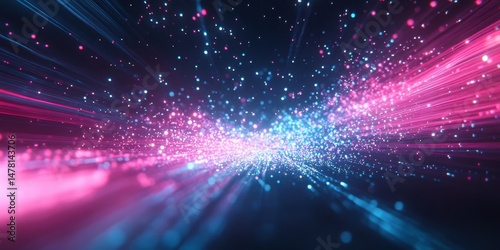 Abstract light streaks and glowing fiber optic cables forming an array of pink, blue, and white lights on a dark background Generative AI