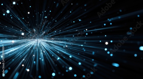 Abstract light streaks radiate from center, resembling a cosmic burst or star trails, with scattered particles of light in varying sizes and intensities against a dark background