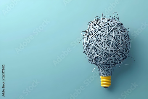 Abstract lightbulb formed from tangled shredded paper, symbolizing complex ideas or overwhelming tasks. Perfect for concepts of brainstorming, problem-solving, and innovation.