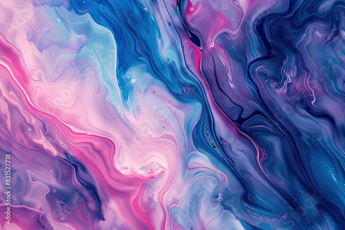 Abstract liquid marble texture background with pink, purple and blue colors. Acrylic paint swirls and waves for a creative design. Close up view of flowing acrylic fluid art in the style of flowing ac