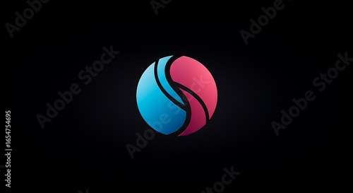 Abstract logo design featuring a stylized, rounded shape with two intertwined, contrasting color elements on a black background.
