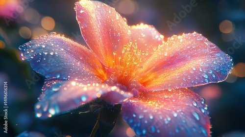 Abstract macro fantasy of dew drops on colorful garden flower in golden sunlight, generative ai high resolution for isolate image