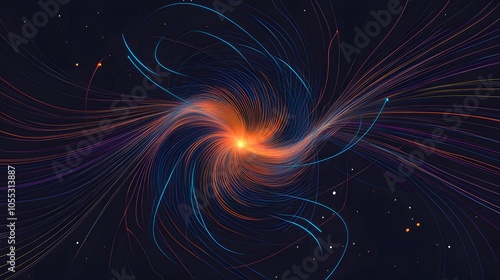 Abstract magnetic field visualization with glowing lines and arrows representing the flow of magnetic force around a central object in a dark, empty space