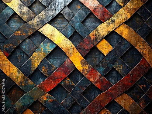 Abstract metallic background with a woven pattern in shades of gold, red, blue and black.