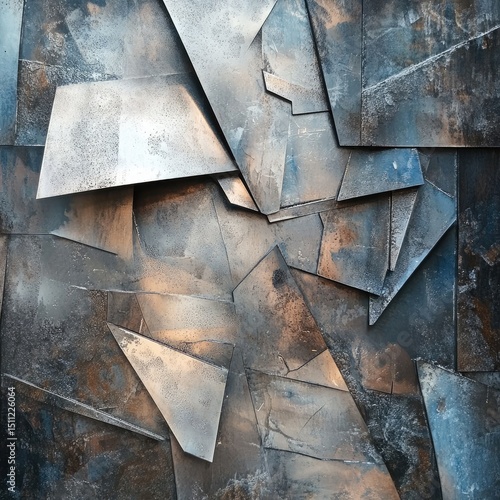 Abstract metallic fragments in various shades of gray, brown, and blue. Interlocking, geometric shapes create a textured surface
