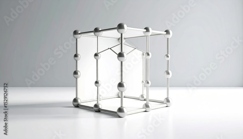 Abstract Metallic Geometric Cube Structure With Spheres And Lines Against White Gradient Background
