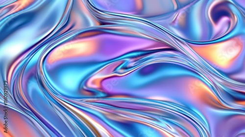 Abstract metallic waves in shades of blue, purple, and orange with smooth, reflective surfaces creating a futuristic, fluid design. Concept: luxury, modernity.