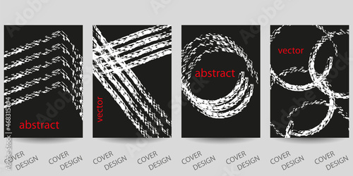 Abstract minimal grunge backgrounds set. White geometric pattern with brush strokes on black background. For printing on covers, banners, sales, flyers. Modern design. Vector. EPS10