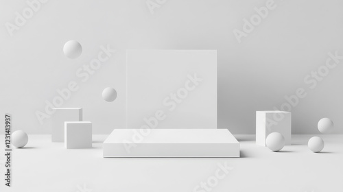 Abstract minimalist scene with white cubes, spheres, and a platform. Clean, modern, and elegant design.