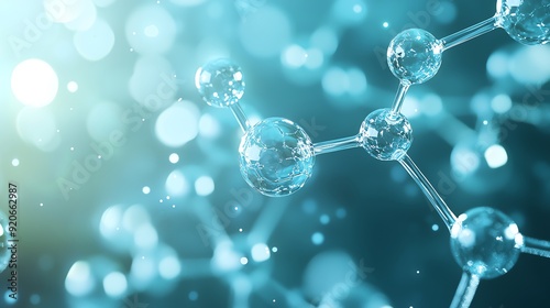 Abstract molecular structure with glowing spheres and soft light, representing scientific innovation and technology.