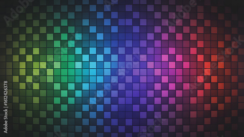 Abstract mosaic of colorful squares transitioning from green to blue to purple to red with a subtle 3D effect