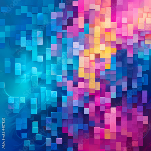 Abstract mosaic pixel pattern in pink, purple, turquoise and yellow