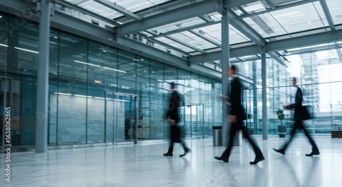 Abstract Motion Blur of People in a Modern Corporate Office Lobby for a Dynamic Business Background.