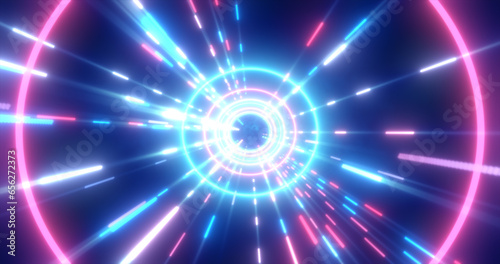 Abstract multi-colored energy futuristic hi-tech tunnel of flying circles and lines neon magic glowing background