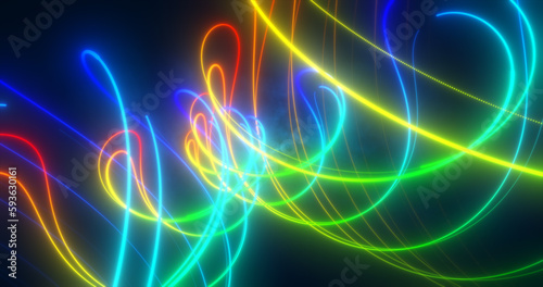 Abstract multi-colored rainbow neon energy laser lines flying on a black background