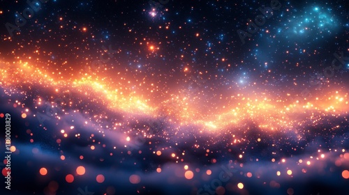 Abstract nebula blue, orange, and sparkling stardust create a surreal cosmic scene
