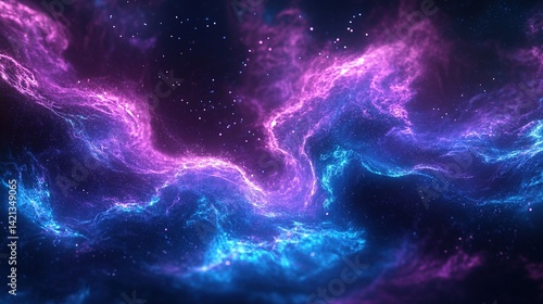 Abstract neon blue and purple digital wave pattern, futuristic fluid dynamics simulation, shimmering particles on dark background.