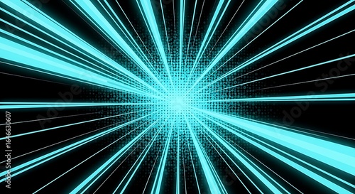 Abstract neon blue light rays exploding from a central point in a digital grid