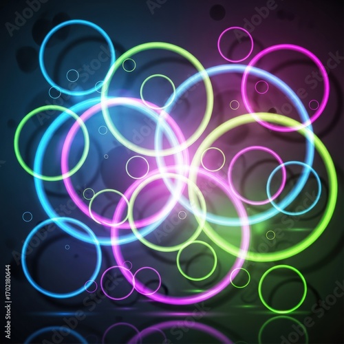 Abstract neon circles glowing with vibrant colors on a dark reflective surface