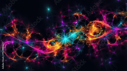 Abstract neon fractal wallpaper with space ultra magnification of a large cluster of neuron synapses in abstract dark space- Generative Ai
