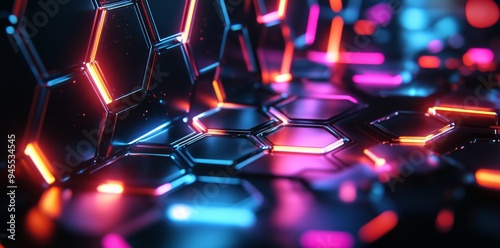 Abstract neon glowing hexagon background, colorful and vibrant.