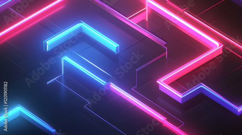 Abstract neon light art, vibrant pink and blue glowing lines forming geometric shapes on a dark background. Perfect for technology, gaming, or futuristic designs.