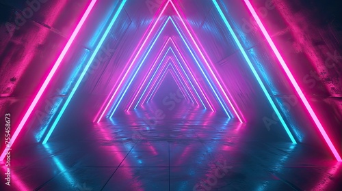 Abstract neon light background with pink-blue triangle tunnel, laser lines, LED glow, Ai Generated.