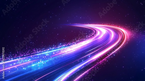 Abstract neon light trails in space. Possible use Background for tech presentations, digital design, gaming, or advertising