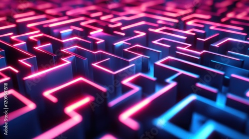 Abstract neon maze, pink and blue glowing lines, complex pattern.