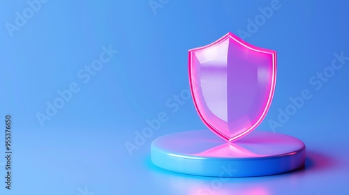 Abstract neon pink shield on a blue pedestal, symbolizing protection and security in a futuristic digital concept.