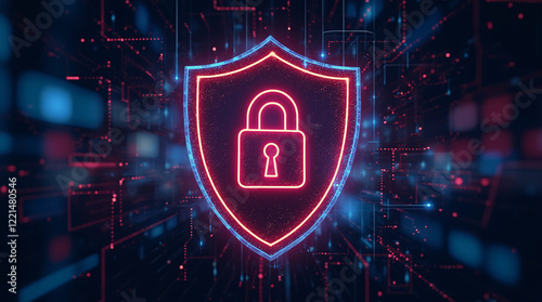Abstract neon representation of cyber security, shield shape with padlock implied, glowing lines and circuit board textures, dark and blurred background, digital art