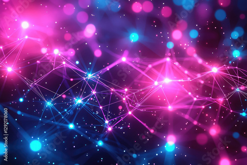 Abstract network connection, glowing pink and blue nodes linked by lines, digital technology concept.