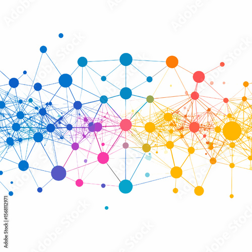 Abstract Network Connections with Blue Purple Orange Red and Yellow Nodes on White Background for Technology and Data Visualization
