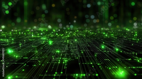 Abstract network grid of interconnected glowing green lines & lights, blurred background