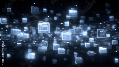 Abstract network grid with files and folders, futuristic software interface, digital document management system, store, search and organize documents, corporate business, paperless office,