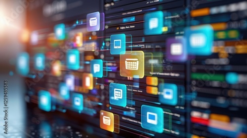 Abstract network grid with files and folders, futuristic software interface, digital document management system, store, search and organize documents, corporate business, paperless office. banner,