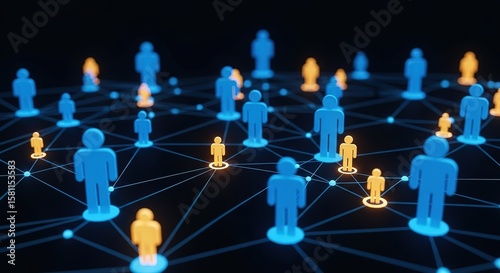 Abstract network of glowing blue and orange human figures connected by luminous lines on a dark background