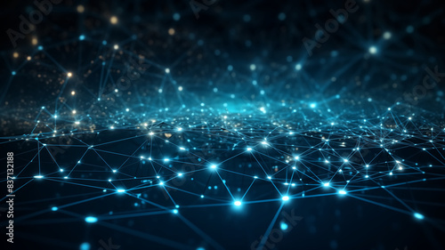 Abstract network of interconnected blue lights and lines on a dark background. Futuristic digital design concept for posters and prints