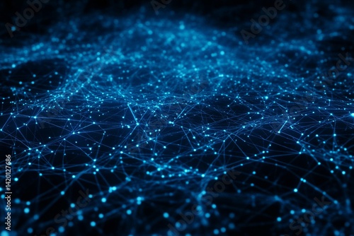 Abstract network of interconnected points and lines. Complex digital structure. Intricate data flow. Deep blue tones. Dynamic